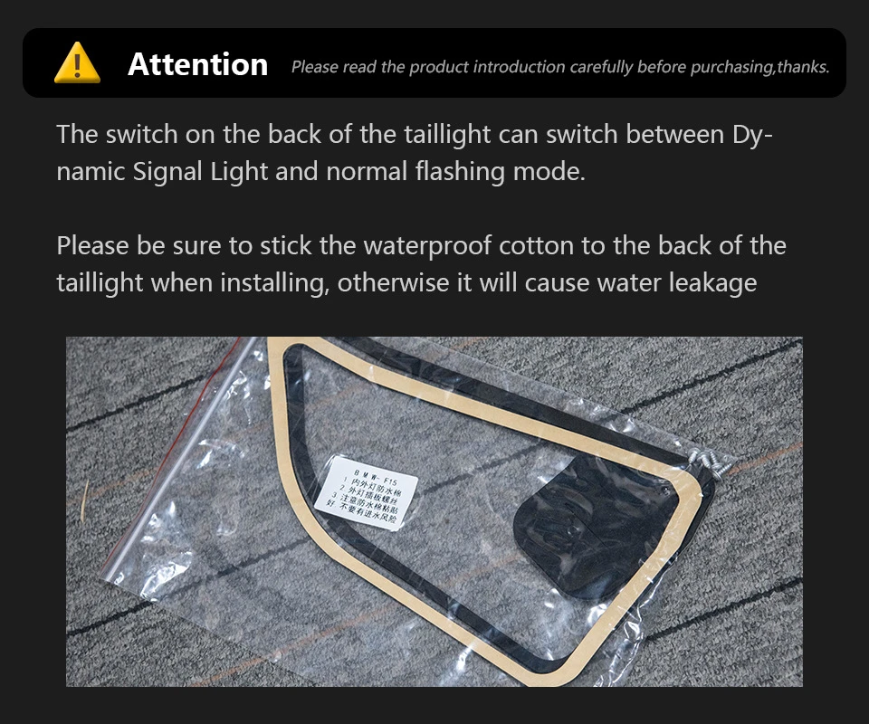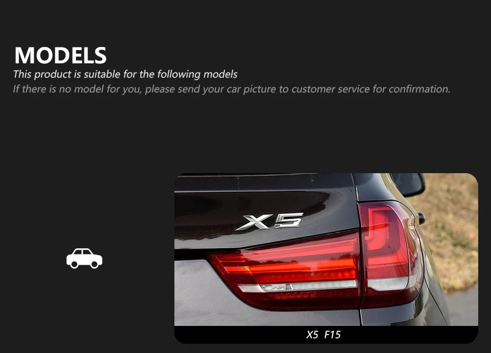The BMW X5 tail light is a premium rear lighting upgrade engineered exclusively for BMW X5 models, merging the SUV’s iconic styling with modern dynamic safety features. As a specialized BMW X5 tail light, it operates on a standard 12V automotive voltage, ensuring seamless integration with the X5’s OEM electrical system—no complex modifications needed. It features a vibrant red running light with an eye-catching start animation (for enhanced rear visibility), a dynamic signal light (for clear turn communication), a bright LED white reversing light (for low-light backup safety), and an included rear fog lamp (for extreme weather conditions).